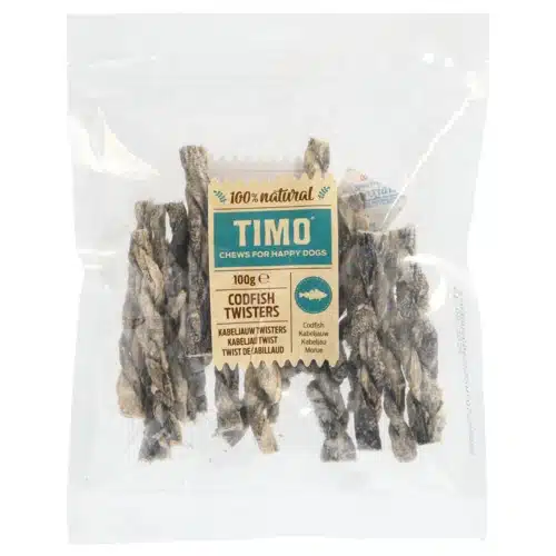 De Timo Kabeljauw Twists 100 gr van Timo zijn heerlijke en gezonde kauwsnacks gemaakt van gedroogde kabeljauwhuid. Deze natuurlijke snack is niet alleen een smakelijke beloning, maar draagt ook bij aan de gezondheid van je hond.